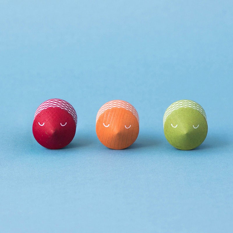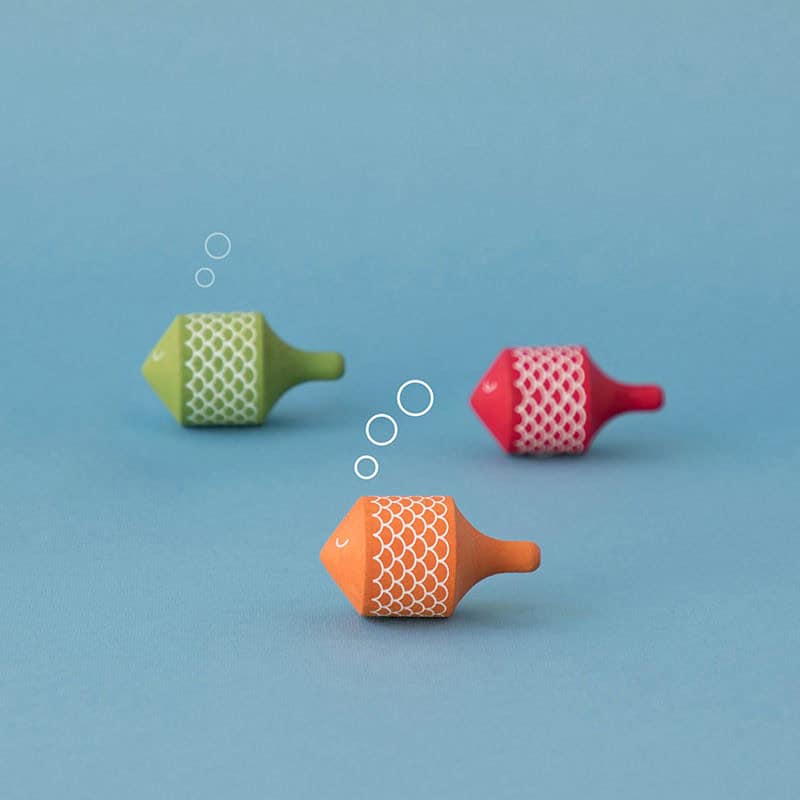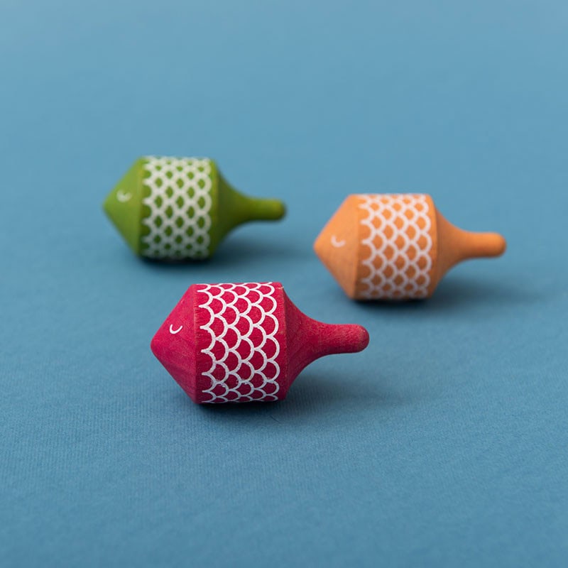 סביבון מעץ מלא, צבוע בעבודת יד, עם חריטות עדינות המדמות קשקשים וזוג עיניים. קלאסי ומקסים.