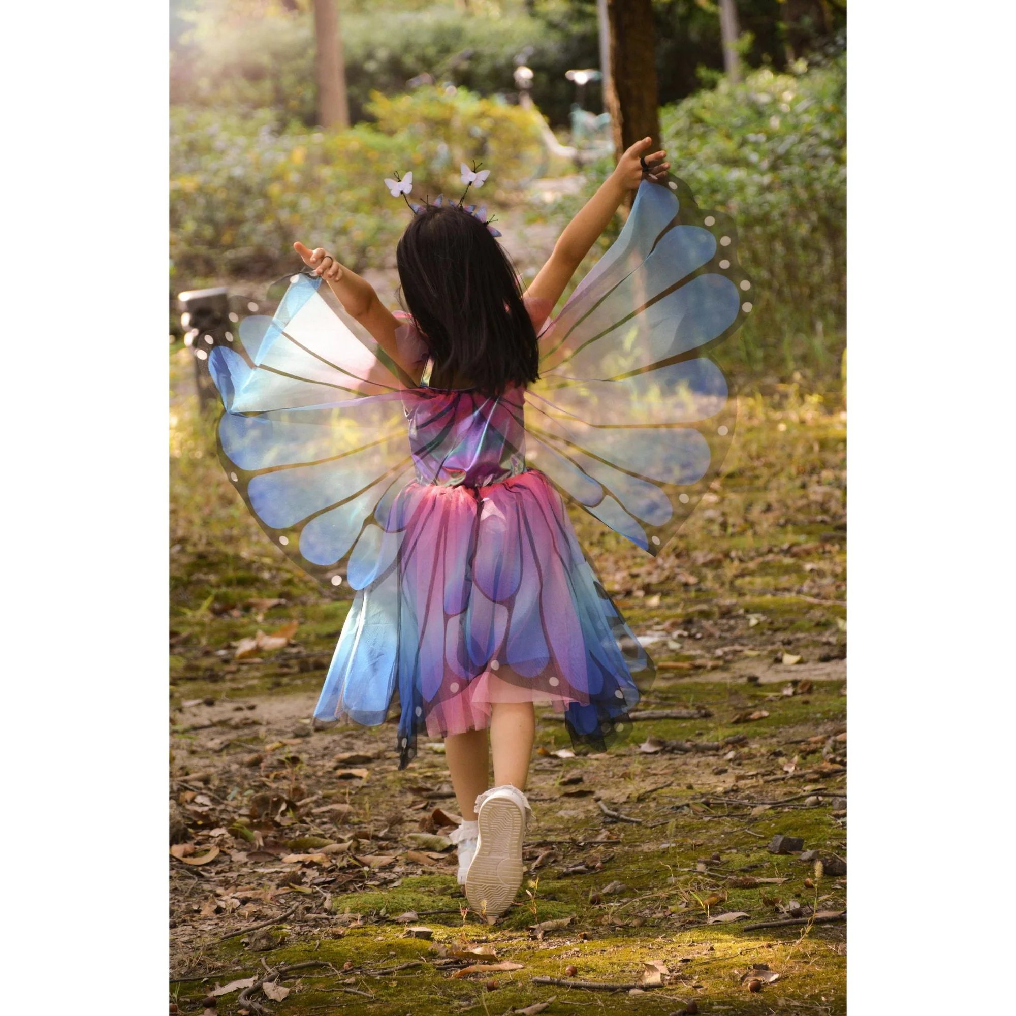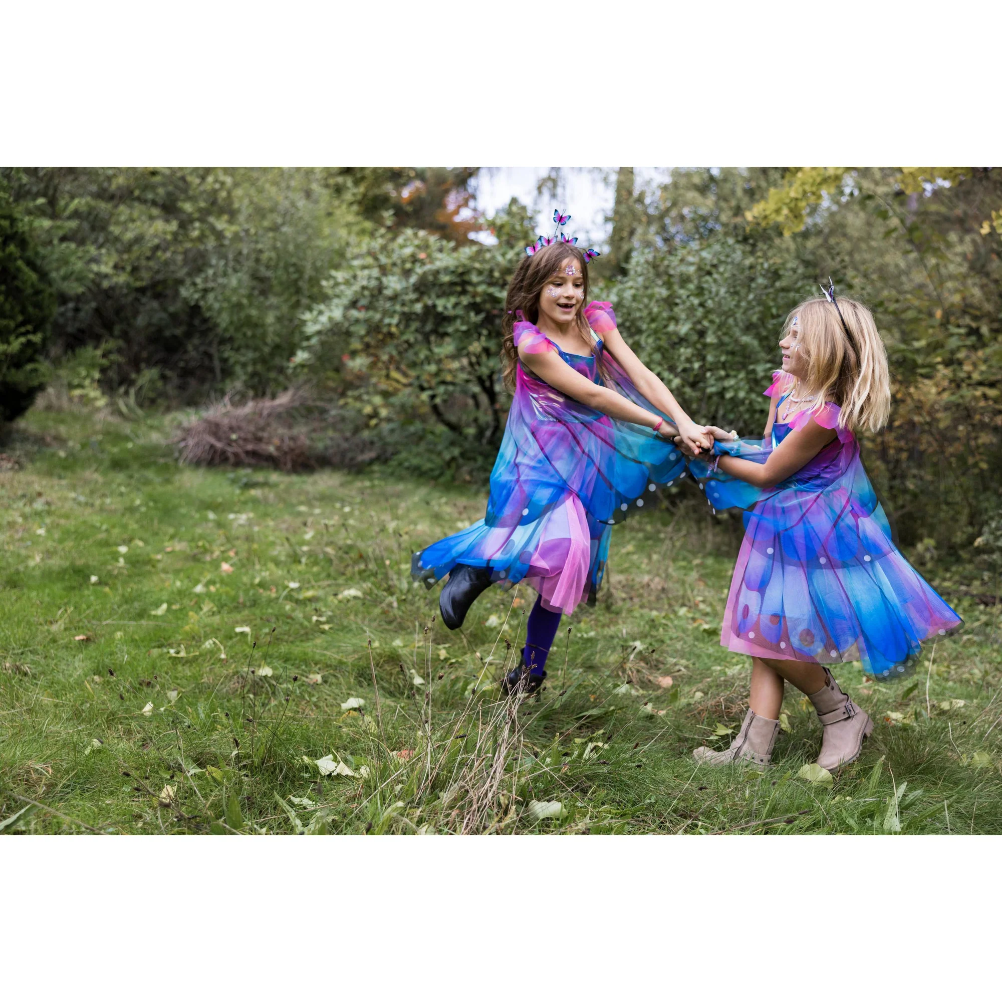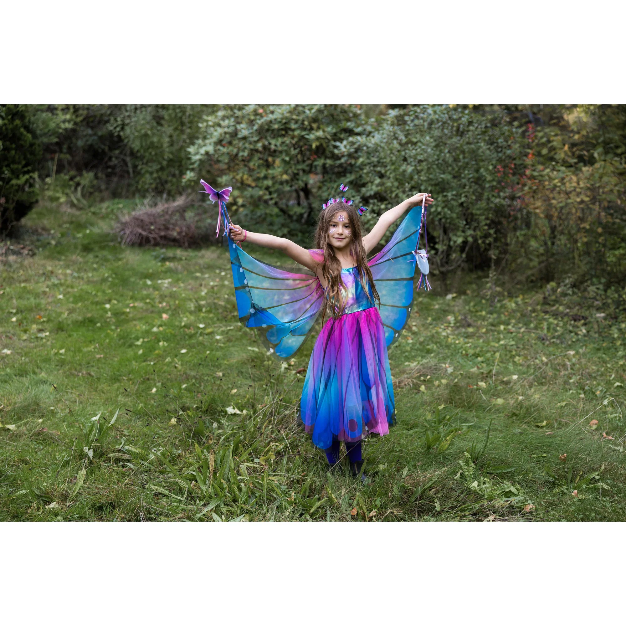 שמלת פרפר כחולה מסתובבת, עם כנפיים וקשת מתאימה. לגילאי 3 עד 8.